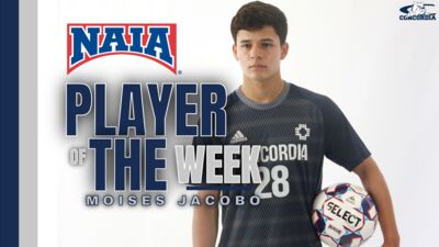 SEWARD, Neb. – Named GPAC Offensive Player of the Week earlier in the morning, sophomore Moises Jacobo has also been awarded the NAIA National Offensive Player of the Week award. The announcement came from the NAIA National Office on Tuesday (Sept. 29). Based on the NAIA honors database, Jacobo is the first Concordia University Men’s Soccer player to ever receive national weekly accolades.