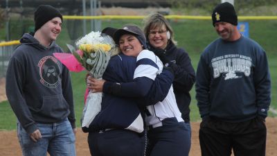 SEWARD, Neb. – The wind was howling at Plum Creek Park as the Concordia University softball team celebrated senior day on Saturday (April 27). The wind had nothing to say to a line drive smash off the bat of Tori Homolka, whose three-run walk-off homer provided the lasting image of the final day of the regular season. Homolka’s big blast completed a doubleheader sweep of Dordt that saw the Bulldogs win by scores of 7-0 and 5-4.