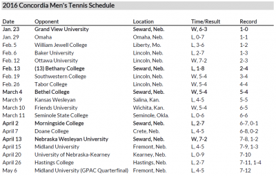CRETE, Neb. – Amidst gusty conditions at the Newburg Held Tennis Complex in Crete, the Concordia University men’s tennis team fell in its sixth match of the 2016 season that has been decided by a 5-4 final. Host Doane held serve on its home courts on Thursday evening.