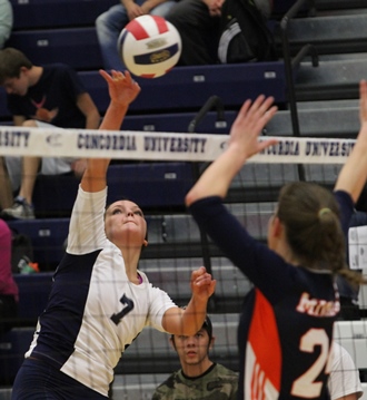 SEWARD, Neb. – Up against two of the nation’s top blockers, the Concordia University offensive attack had its work cut out for it. No. 12 Midland (22-7, 12-4 GPAC) used a strong defensive effort to limit the Bulldogs to a .089 hitting percentage as the visitors claimed a 25-17, 20-25, 25-20, 25-20 win inside Walz Arena on Wednesday night.