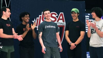 Said Myles, “I knew it was going to be a battle because he had to beat the reigning champion from the University of Oregon. I knew what that kid was capable of. Kaiden had some good training leading into transferring here and then had some personal bests leading into nationals. There was a kid in the B session that posted a really good total, so we knew what Kaiden needed to beat him. Kaiden won it with his second clean & jerk, so then he got to try a huge PR. He’ll definitely be the favorite next year.”