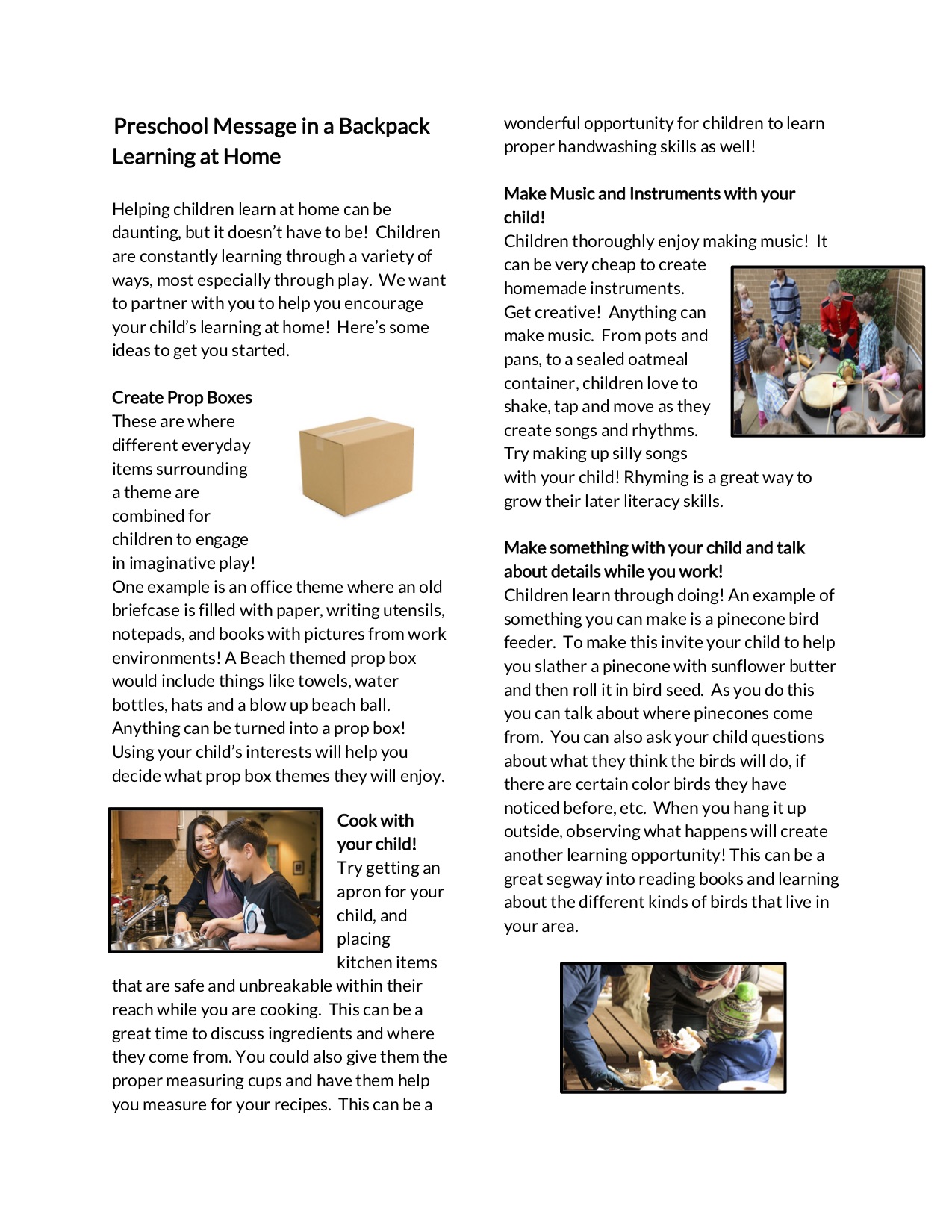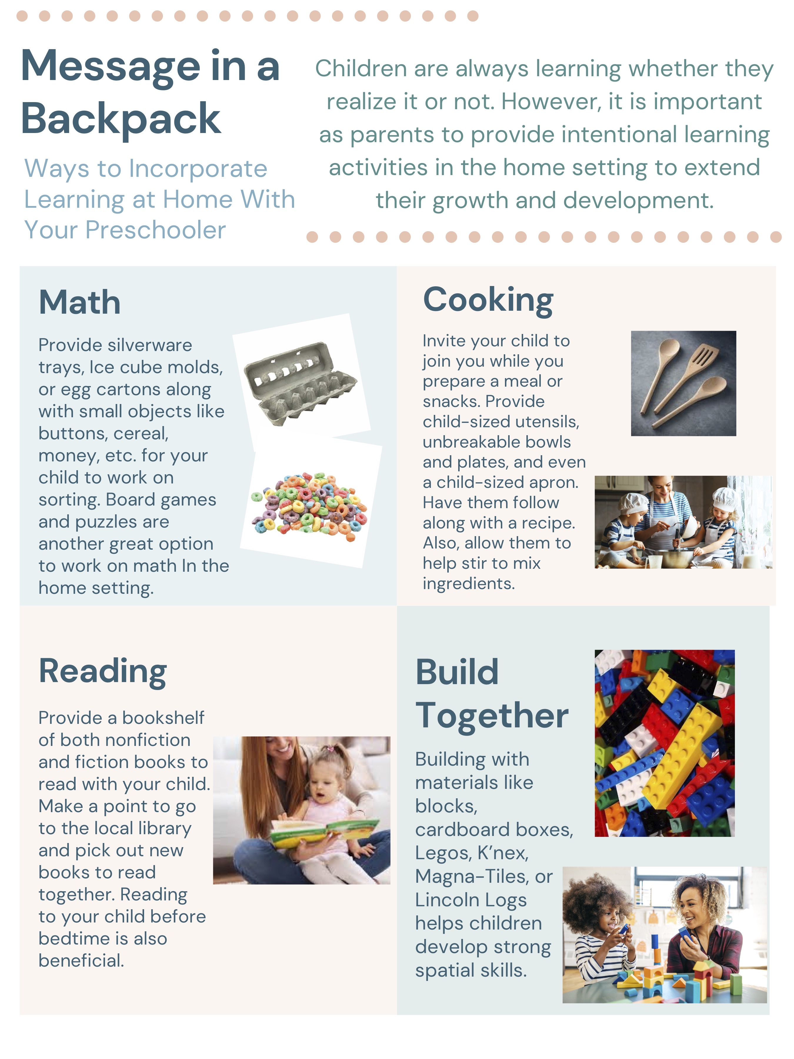 The goal for the Messages in a Backpack is to be sent home once a week to help parents stay informed about appropriate early childhood growth and development and expectations, timely topics—such as how to deal with holidays, community events, crisis, family changes—and to provide them with tips for learning at home.